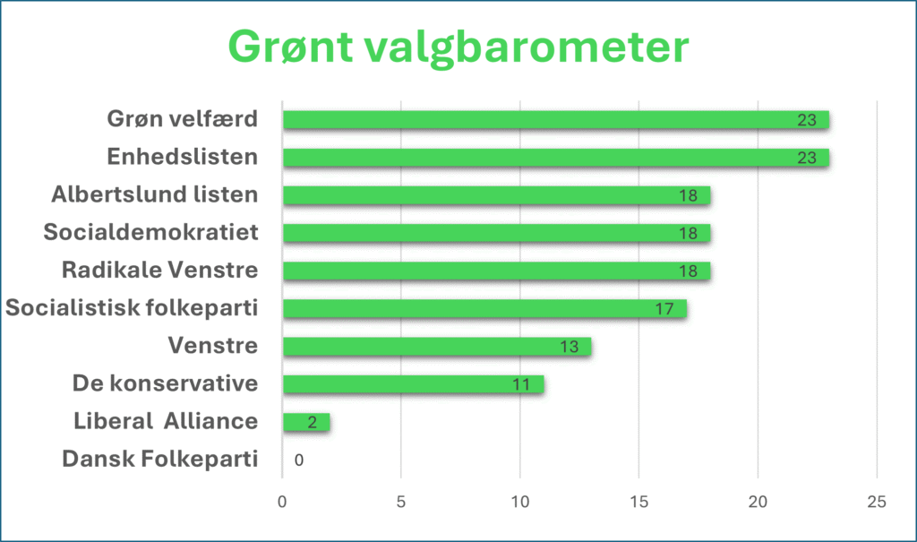 Hvor grønne er de opstillede partier her i Albertslund? Vi har stillet alle de opstillede partier 12 spørgsmål, om klimahandling. På baggrund af deres svar har vi “scoret”, hvor grønne de er. Se barometeret ovenfor. De stillede spørgsmål kan I se her. Generelt er der forholdsvis bred tilslutning fra mange partier til en række af de grønne indsatser. Stort set alle partier er enige om, at vi skal have biomassen ud af fjernvarme så hurtigt som muligt. Så er der forskellige vurderinger af, hvor hurtigt det så er realistisk Der er også ret bred tilslutning til hastighedsnedsættelser om end det ikke skal gælde for alle veje. Parkeringsafgifter er der også en del tilslutning til, men kun lokalt afgrænsede afgifter. På spørgsmålet om offentlig transport, er der mange partier, der gerne vil undersøge såvel muligheden for gratis transport i Albertslund eller alternativt en nedsættelse af prisen til 15. kr. for en enkelt billet. Der er også bred tilslutning til at udvide antallet af afgange på busserne -særligt i ydertimerne. Hvad angår ladestandere og delebiler, er der derimod mange forbehold, så det er en meget blandet tilslutning. Om solceller langs motorvejene er der fuld tilslutning hele vejen rundt – så det er bare med at gå i gang i den nye kommunalbestyrelse. Spørgsmålet om at skille prisen for af P-plads fra lejen for boligen, skiller også partierne; men de fleste er imod. Hvad angår stop for nedrivninger (bevar eller forsvar), så er der også en overvejende tilslutning. På spørgsmålet om mindre boligstørrelser, er de fleste imod. Hvad angår udledningerne fra kommunale indkøb, er stort set alle partier for. Det samme gælder spørgsmålet om at sætte sætte pejlemærker for forbrugets udledninger. Bemærkninger fra en række af partierne Flere af partierne har imidlertid knyttet en række bemærkninger til deres besvarelse. Selvom ikke alle partier har benyttet sig af dette (hvad vi heller ikke havde bedt om), gengiver vi her alligevel disse bemærkninger, det må være mest fair. Disse bemærkninger samt et samlet skema over partiernes besvarelse kan ses her: Hvad svarede partierne – Rundspørge KV 25