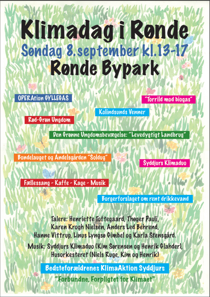 Igen i år arrangerer Bedsteforældrenes KlimaAktion en klimadag i Byparken i Rønde. I år med specielt fokus på gylle og biogas. Der vil ligefrem blive opført en lille opera. Godt nok har vi ikke professionelle operasangere, men der vil lyde kendt operamusik med nye tekster. Man vil kunne høre nyt fra Kolindsunds Venner, som nu endelig er ved at få medvind fra Syddjurs Byråd i kampen for at få genetableret Jyllands største sø, som Kolindsund jo var for 150 år siden. Thøger Pauli taler. Karen Krogh Nielsen fra Den Grønne Ungdomsbevægelse vil give os indsigt i hvordan fremtidens landbrug kunne blive. Hun er en af forfatterne til bogen “Levedygtigt Landbrug” Man kan høre om Torrild-borgernes kamp mod etableringen af et stort biogasanlæg ved deres landsby vest for Odder. Henriette Toftegaard fra foreningen “Bevar Torrild og Omegn” kommer til Rønde på klimadagen. Anders Led Behrend fra jordbruget “Soldug” ved Elsegårde fortæller om projektet med andelsgårde og foreningen “Bondelauget”. Hanne Vittrup vil snakke lidt om den skæbne, som vores borgerforslag om rent drikkevand led. Syddjurs Klimaduo vil give sin første offentlige koncert. Glæd jer! Og så vil der selvfølgelig være kaffe og kage og fællessang